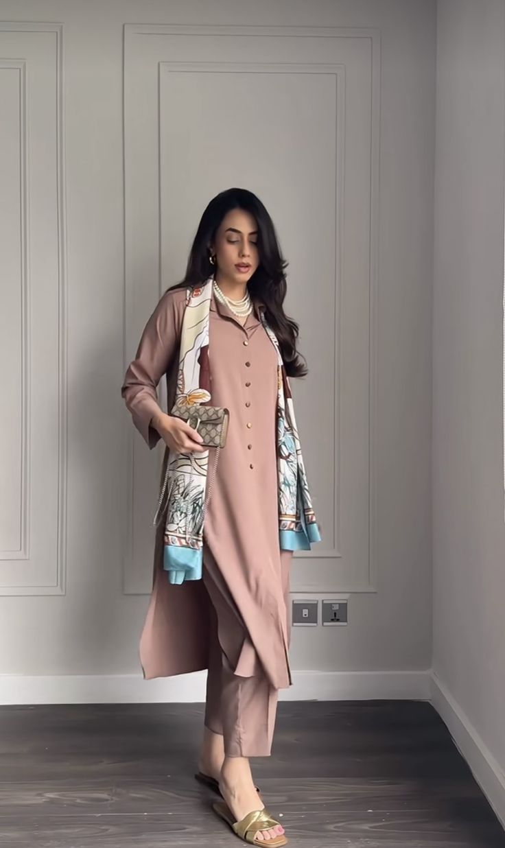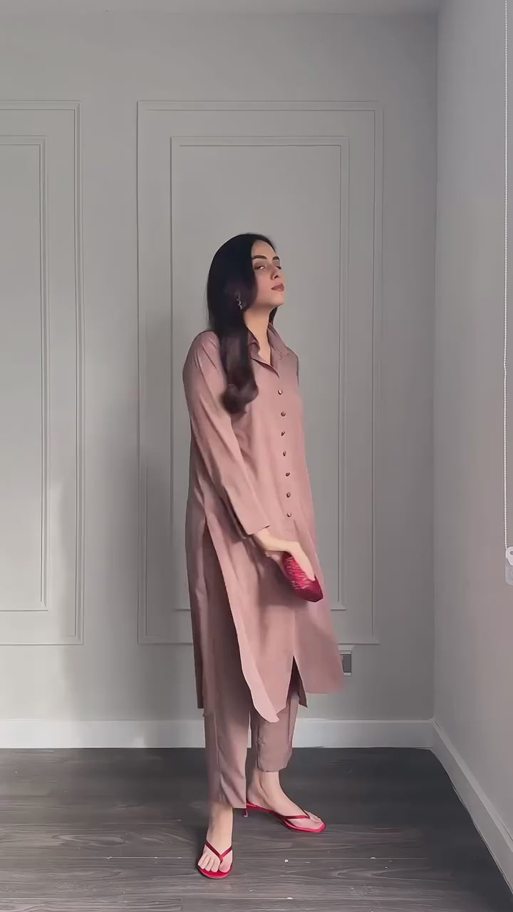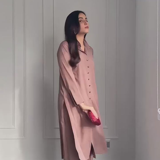 Effortlessly elegant and versatile, this Minimal Chic Two-Piece Co-Ord Set in a soft rosewood shade is a timeless wardrobe essential. Featuring a long button-down kurta with a classic collar and straight-cut trousers, this co-ord set blends comfort with understated sophistication.